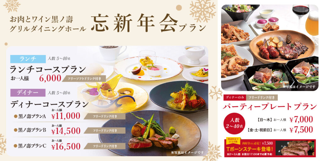 忘年会、新年会にピッタリのフリードリンク付きのプランです。